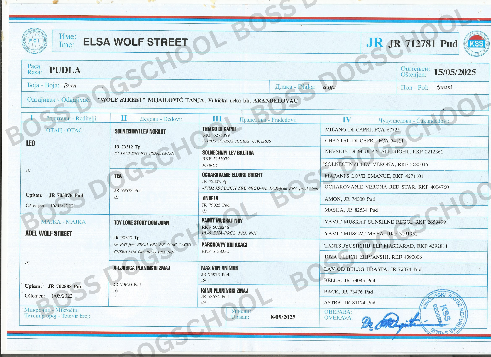 Ένα κουτάβι που κουβαλάει την ιστορία του Σέρβικου εκτροφείου της Wolf Street, με παράδοση στην εκλεκτή εκτροφή και την απόλυτη φροντίδα. Η Elsa είναι η πέμπτη γενιά ποιότητας, επιλογής και ισορροπίας, με γονείς που ξεχωρίζουν για τον χαρακτήρα, την υγεία αλλά και την εμφάνιση τους. Είναι η επιτομή της εκλεπτυσμένης εκτροφής, με κάθε βήμα να γίνεται με σεβασμό στην φυλή και την διατήρηση των αυθεντικών χαρακτηριστικών της.